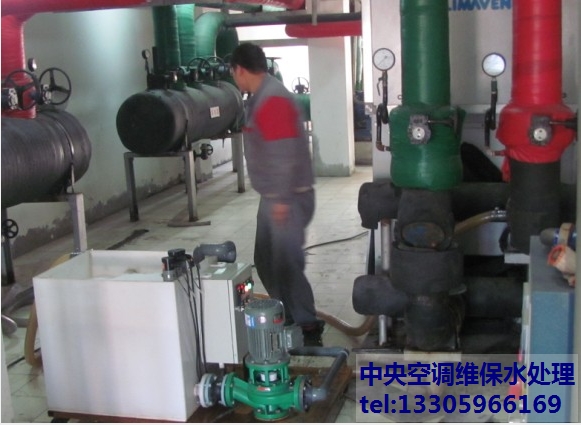 螺桿式冷水機(jī)冷凝器極易結(jié)垢,正常在夏季供冷期應(yīng)該做日常水處理,否則在高硬度水質(zhì)的環(huán)境下運行,循環(huán)水系統(tǒng)內(nèi)溶于水中的無機(jī)鹽就會隨著溫度的升高結(jié)晶析出,在冷凝器換熱面管壁上形成水垢,導(dǎo)致熱交換效率降低。同時硬垢增加,則能耗上升,結(jié)硬質(zhì)水垢1mm厚時會增加6%—8%。 ![]() 1、將冷卻水進(jìn)出冷凝器的閥門關(guān)緊,利用溫度計管、壓力表管或排污管連接防腐泵、配液箱做成小循環(huán)系統(tǒng),循環(huán)清洗。 2、先加入酸洗緩蝕劑,此藥劑為專用銅緩蝕劑,它附著在冷凝器金屬內(nèi)壁上,防止酸和金屬發(fā)生反應(yīng)。 3、加入固體酸洗清洗劑,用于清洗碳酸鈣垢為主要成份的水垢,清洗劑是復(fù)合固體有機(jī)酸,白色晶體,對金屬的無腐蝕性,為弱酸;清洗劑用量按設(shè)備結(jié)垢量而定。 4、加入泥垢剝離劑(可選),如果冷凝器設(shè)備結(jié)垢較厚時,需要添加泥垢剝離劑,促進(jìn)水垢反應(yīng)后的生成物快速溶于水,加快深層水垢反應(yīng)。 5、加入中和鈍化劑,在冷凝器進(jìn)行化學(xué)清洗后,中化殘酸,防止金屬表面氧化而生成二次浮銹。 6、清洗工藝 清洗溫度:一般采用常溫清洗,如果結(jié)垢較厚可以在40—50℃清洗以提高清洗速度。 將進(jìn)出機(jī)組的閥門關(guān)上,利用壓力表或溫度計管、防腐泵、酸液箱連成清洗循環(huán)系統(tǒng)。清洗時先加入緩蝕劑,緩蝕劑循環(huán)均勻后緩慢加入有機(jī)酸,清洗中應(yīng)定時檢測反應(yīng)情況,清洗劑不足時需補足,以保證有足夠的酸液和水垢反應(yīng),清洗中按水垢反應(yīng)情況,可加入適量泥垢剝離劑、消泡劑等。 清洗結(jié)束后,要將余液排出,并加入清水沖洗。 冷凝器清洗后還需要加入中和鈍化劑,中和殘酸,以防止金屬內(nèi)壁氧化。 冷凝器清洗時間為5~10小時左右,按實際情況而定。 |