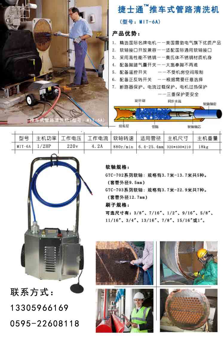 國內(nèi)首創(chuàng)中央空調(diào)冷凝器清洗軟軸緩解裝置.清洗機(jī)軟軸造價昂貴但同時又極易損壞,這成了所有工程人員面臨的巨大難題.我公司在2006年即成立軟軸科研項(xiàng)目小組,不斷提高軟軸材質(zhì)并多次人工模擬極端惡劣環(huán)境進(jìn)行試驗(yàn).同時,科研人員在07年底設(shè)計出軟軸緩解裝置,該裝置在軟軸卡住的情況下將電機(jī)輸送力度減小%60,這樣可以有效的保護(hù)軟軸.這一技術(shù)在08年得到了完善并于09年正式面市.精選的材質(zhì)和獨(dú)到的保護(hù)裝置使軟軸使用壽命延長一倍以上. 二, 刷頭工具采用上等材質(zhì)精致而成,刷頭種類更多,刷毛有效長度增加,清洗效率也大大提高.刷毛的材質(zhì)直接影響到清洗的效率而刷頭的整體尺寸更是影響到軟軸的動力傳輸.刷頭選用不合理很可能造成軟軸卡在銅管里,嚴(yán)重時軟軸將直接斷掉.我公司技術(shù)人員多次分析比較不同規(guī)格刷頭的使用效果,進(jìn)而設(shè)計出清洗效率更高同時對軟軸力度傳輸影響又最小的刷頭規(guī)格. 三, 主機(jī)采用多級控制電路.該技術(shù)可保證主機(jī)的使用連續(xù)性,保證用戶的清洗工程不會因?yàn)闄C(jī)器不能使用而耽誤.
